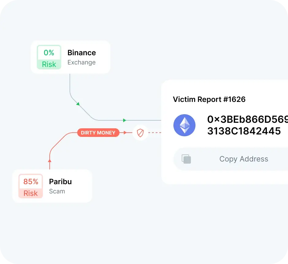 Просматривайте прямые и косвенные связи между заданным адресом и выявленными кластерами, общую сумму, отправленную на/из целевого кошелька, и расстояние до него.